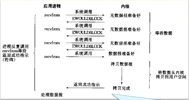 当用户进程发出read操作时,如果kernel中的数据还没有准备好,那么它并不会block用户进程,而是立刻返回一个error。从用户进程角度讲 ,它发起一个read操作后,并不需要等待,而是马上就得到了一个结果。用户进程判断结果是一个error时,它就知道数据还没有准备好,于是它可以再次发送read操作。一旦kernel中的数据准备好了,并且又再次收到了用户进程的system call,那么它马上就将数据拷贝到了用户内存,然后返回。