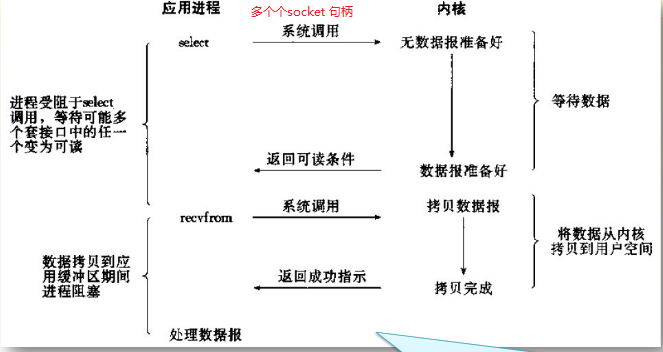 当用户进程调用了select,那么整个进程会被block,而同时,kernel会“监视”所有select负责的socket,当任何一个socket中的数据准备好了,select就会返回。这个时候用户进程再调用read操作,将数据从kernel拷贝到用户进程。
